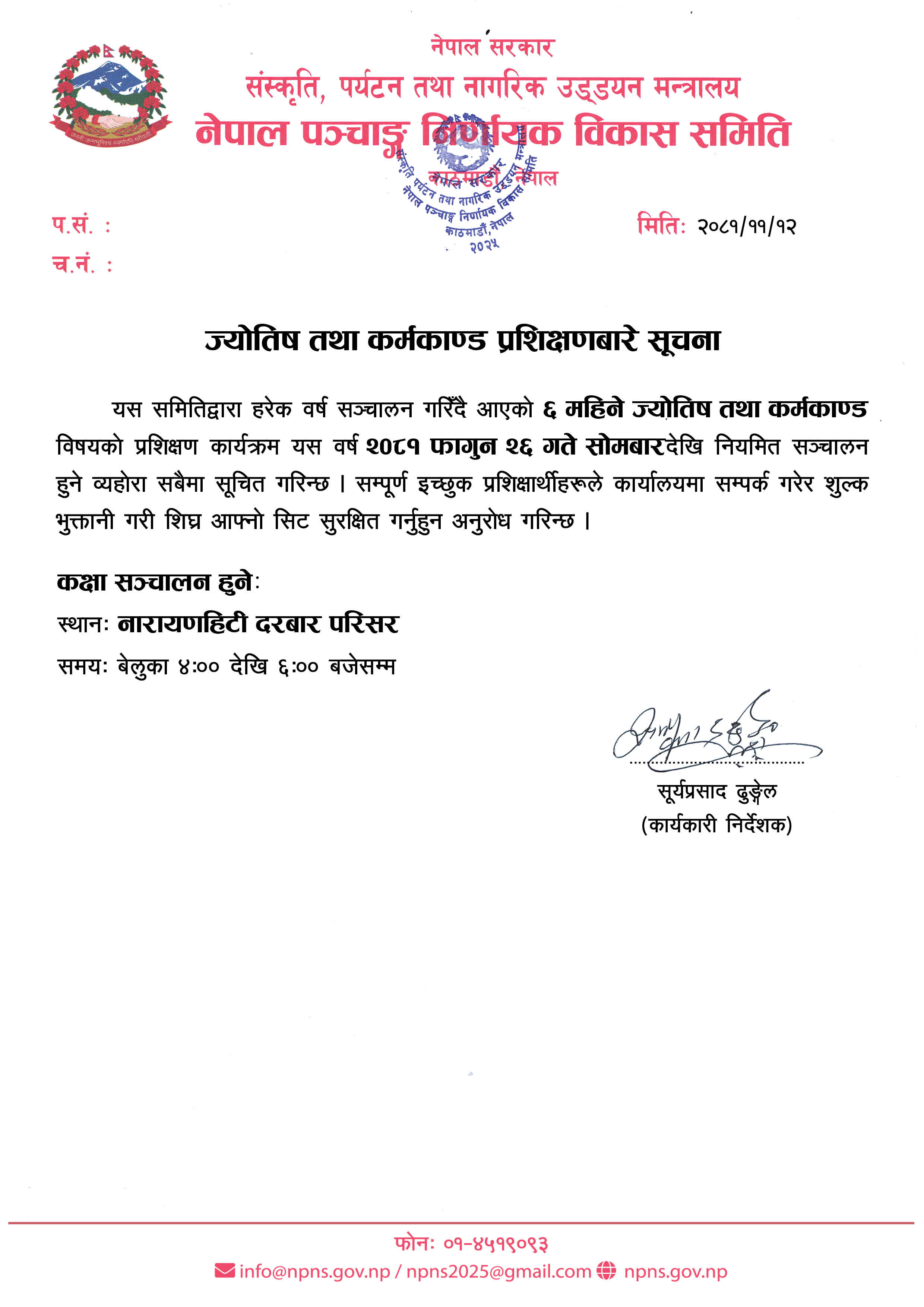 यस समितिबाट अनुभवी प्रशिक्षकहरूबाट प्रयोगात्मक रूपमा आधुनिक शिक्षण प्रविधिद्वारा ज्योतिष तथा कर्मकाण्डसम्बन्धी कक्षाहरू २०६३ सालदेखि निरन्तर सञ्चालन भइरहेका छन् ।
